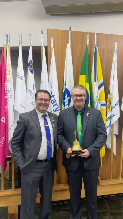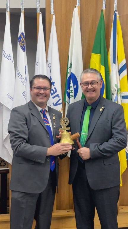 O companheiro Idair Edson Marcello, presidente no ano 2024/25, passou o cargo para o novo presidente Roberto Luiz Borghetti, que assume a liderança no ano rotário 2025-26.