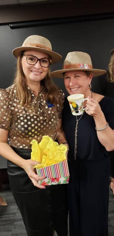 Das mãos da canadense e do peruano, os companheiros admitidos receberam os seus chapéus - que é o símbolo dos rotarianos nas regiões Oeste, Sudoeste e Centro-Sul do Paraná, representando um lembrete de que há uma força maior que está acima de todos.