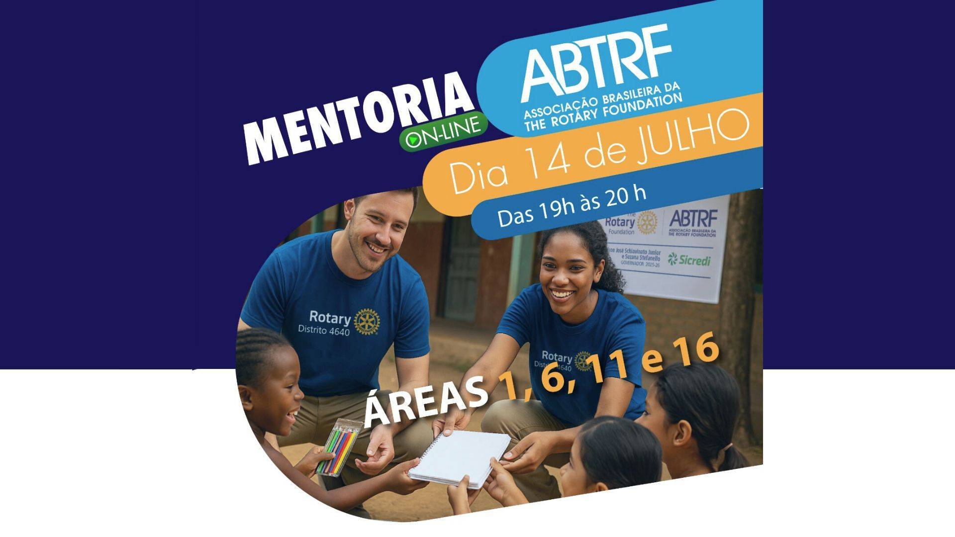 Rotariano(a), marque na sua agenda! No dia 14 de julho, das 19h às 20h, acontecerá a Mentoria Online da ABTRF (Associação Brasileira da The Rotary Foundation), direcionada às Áreas 1, 6, 11 e 16 do Distrito 4640.